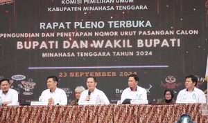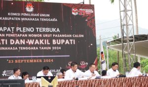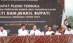 MITRA, Bunaken.co.id– Komisi Pemilihan Umum (KPU) Kabupaten Minahasa Tenggara (Mitra) menggelar rapat pleno terbuka untuk pengundian dan penetapan nomor urut pasangan calon Bupati dan Wakil Bupati Tahun 2024 yang dilaksanakan di Lapangan Kantor DPRD Mitra, Senin (23/9/ 2024).