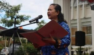 Dengan mengenakan seragam Korpri lengkap para pimpinan, staf, dan dosen Polimdo mendengarkan arahan dari Direktur Polimdo Dra. Mareuke Alelo, MBA.