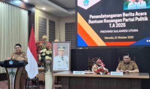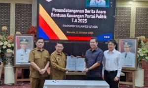 Manado, Bunaken.co.id – Asisten 1 Setdaprov Sulut, Denny Mangala, mewakili Gubernur Yulius Selvanus, menyerahkan Bantuan Keuangan Tahun 2025 sebesar Rp1,7 miliar kepada 9 (Sembilan) partai politik (Parpol), yang dilaksanakan di Ruang C.J. Rantung, Kantor Gubernur Sulut, Selasa (21/10/2025).
