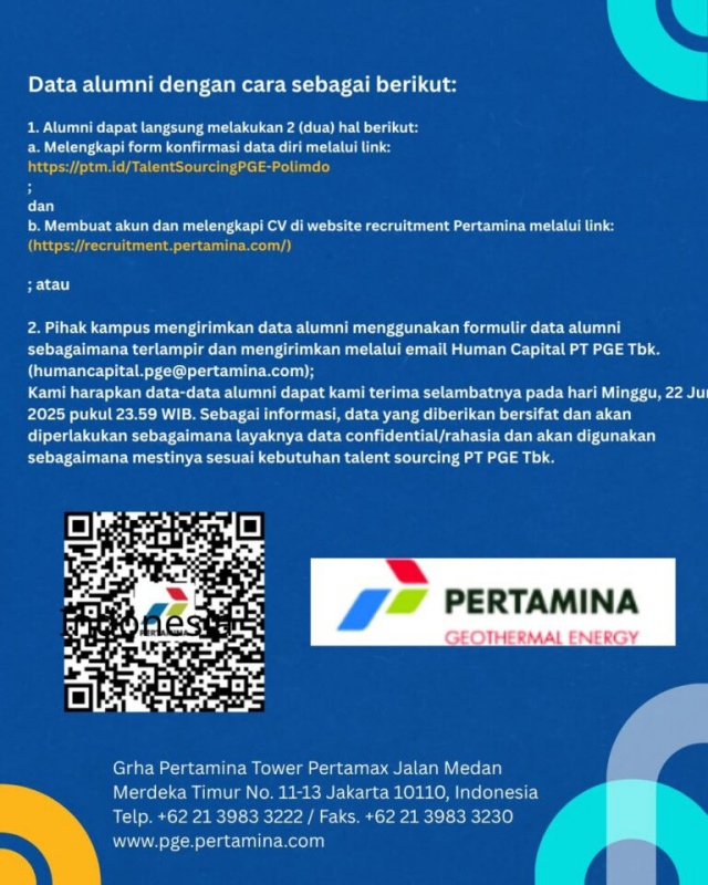 Kami harapkan data-data alumni dapat kami terima selambatnya pada hari Minggu, 22 Juni 2025 pukul 23.59 WIB. Sebagai informasi, data yang diberikan bersifat danakan diperlakukan sebagaimana layaknya data confidential/rahasia dan akan digunakan sebagaimana mestinya sesuai kebutuhan talent sourcing PT PGE Tbk. Demikian disampaikan, atas bantuan dan kerjasamanya diucapkan terima kasih. (***/Jrp)