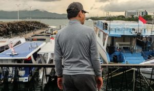 Area dermaga tampak basah, bahkan hingga ke permukaan yang seharusnya kering, mengindikasikan adanya perubahan cuaca yang signifikan di perairan Teluk Manado.