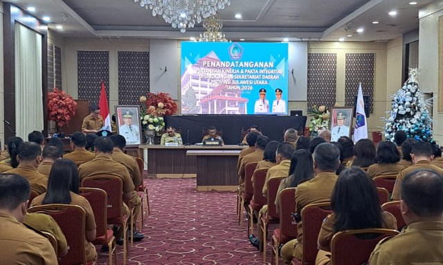 MANADO, Bunaken.co.id – Sekretaris Provinsi (Sekprov) Sulawesi Utara, Tahlis Gallang, memimpin seremoni penandatanganan Pakta Integritas yang melibatkan seluruh pejabat di lingkungan Sekretariat Daerah Pemerintah Provinsi Sulawesi Utara, Senin (12/1/2026).